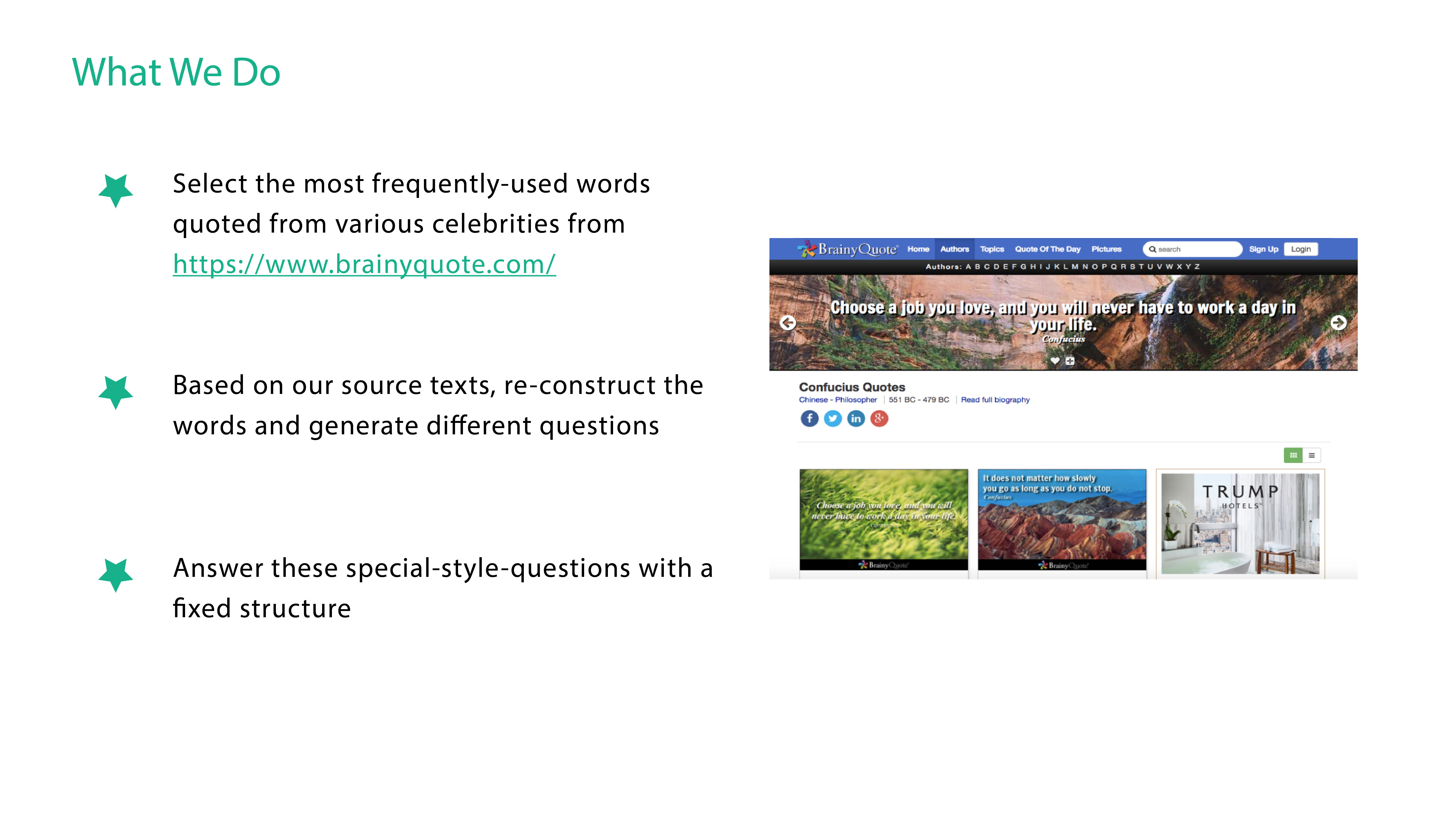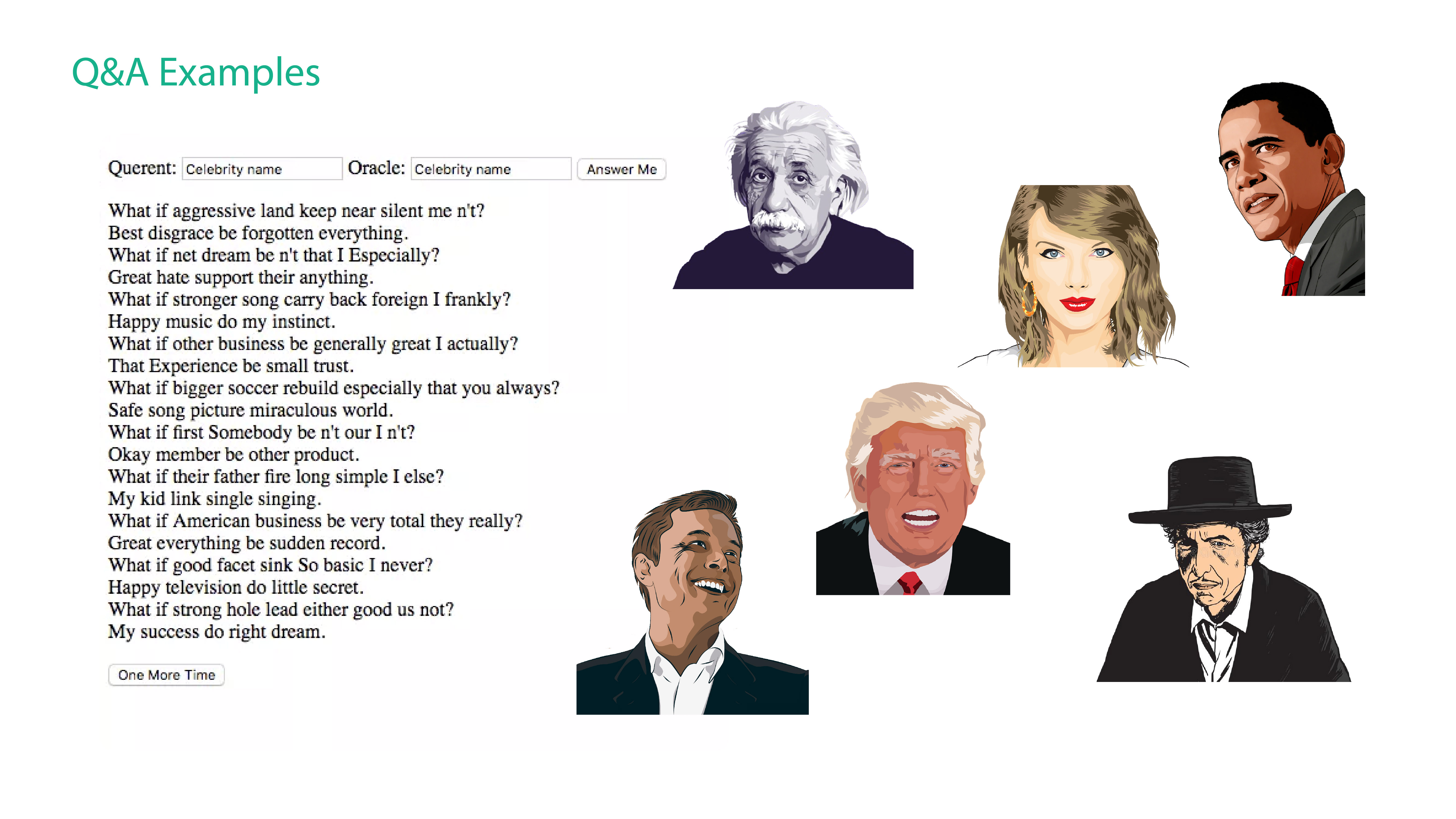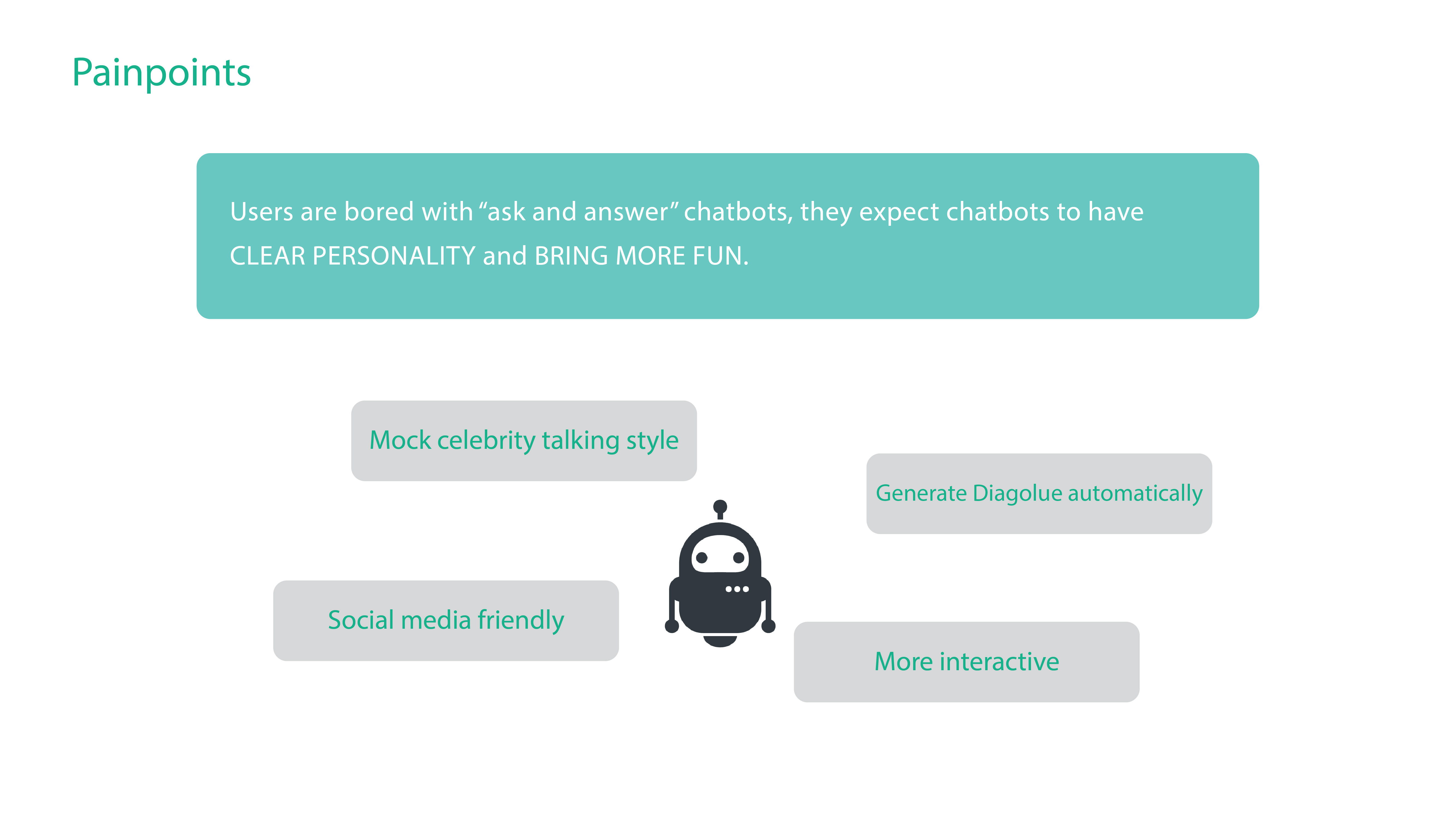 No matter whether the celebrity is still alive, no matter what language the celebrity speaks, as long as some original speeches or writings can be found and translated, we can create a chatbot based on any specific styles and characteristics. By simply selecting two or more celerities, our user can create a decent dialogue among them.