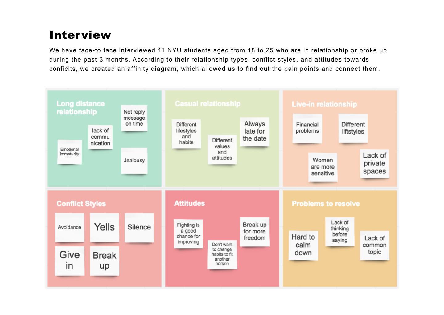 Interview, Affinity diagram, Moscow analysis, Persona Site map, User flow, Wireframe, Usability testing, Interface design